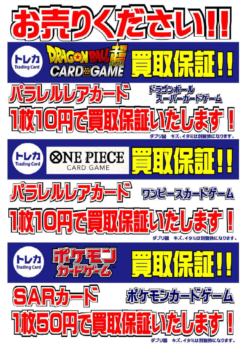 高価買取に記載されているカードは、分けてお持込下さい。 (分けていない場合は、査定時間が長時間になる場合がございます)