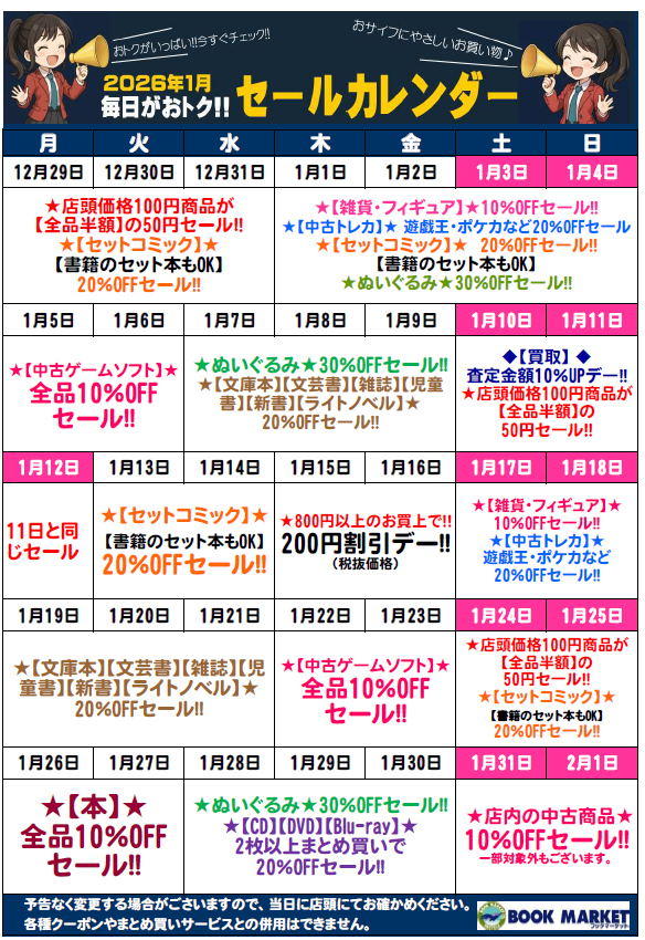 12月30日(火)★店頭価格100円商品が【全品半額】の50円セール!! ★【セットコミック】20%OFF!! 12月31日(水)★店頭価格100円商品が【全品半額】の50円セール!! ★【セットコミック】20%OFF!! 1月1日(木)★【雑貨・フィギュア】10%OFFセール!!★【中古トレカ】 遊戯王・ポケカなど20%OFFセール!!★【セットコミック】20%OFFセール!!(書籍のセット本も割引対象です)★ぬいぐるみ30%OFFセール!! 1月2日(金)★【雑貨・フィギュア】10%OFFセール!!★【中古トレカ】 遊戯王・ポケカなど20%OFFセール!!★【セットコミック】20%OFFセール!!(書籍のセット本も割引対象です)★ぬいぐるみ30%OFFセール!! 1月3日(土)★【雑貨・フィギュア】10%OFFセール!!★【中古トレカ】 遊戯王・ポケカなど20%OFFセール!!★【セットコミック】20%OFFセール!!(書籍のセット本も割引対象です)★ぬいぐるみ30%OFFセール!! 1月4日(日)★【雑貨・フィギュア】10%OFFセール!!★【中古トレカ】 遊戯王・ポケカなど20%OFFセール!!★【セットコミック】20%OFFセール!!(書籍のセット本も割引対象です)★ぬいぐるみ30%OFFセール!! 1月5日(月)★【中古ゲームソフト】全品10%OFF!! 1月6日(火)★【中古ゲームソフト】全品10%OFF!! 1月7日(水)★【文庫本】【文芸書】【雑誌】【児童書】【新書】【ライトノベル】20%OFFセール!!★【ぬいぐるみ】30%OFFセール!! 1月8日(木)★【文庫本】【文芸書】【雑誌】【児童書】【新書】【ライトノベル】20%OFFセール!!★【ぬいぐるみ】30%OFFセール!! 1月9日(金)★【文庫本】【文芸書】【雑誌】【児童書】【新書】【ライトノベル】20%OFFセール!!★【ぬいぐるみ】30%OFFセール!! 1月10日(土)★店頭価格100円商品が【全品半額】の50円セール!! ★【買取】査定金額10%UPデー!! 1月11日(日)★店頭価格100円商品が【全品半額】の50円セール!! ★【買取】査定金額10%UPデー!! 1月12日(月)★店頭価格100円商品が【全品半額】の50円セール!! ★【買取】査定金額10%UPデー!! 1月13日(火)★【セットコミック】20%OFFセール!!(書籍のセット本も割引対象です) 1月14日(水)★【セットコミック】20%OFFセール!!(書籍のセット本も割引対象です) 1月15日(木)★800円以上のお買上で!!200円割引デー!!(税抜価格) 1月16日(金)★800円以上のお買上で!!200円割引デー!!(税抜価格) 1月17日(土)★【雑貨・フィギュア】10%OFFセール!!★【中古トレカ】 遊戯王・ポケカなど20%OFFセール!!★【セットコミック】20%OFFセール!!(書籍のセット本も割引対象です)★ぬいぐるみ30%OFFセール!! 1月18日(日)★【雑貨・フィギュア】10%OFFセール!!★【中古トレカ】 遊戯王・ポケカなど20%OFFセール!!★【セットコミック】20%OFFセール!!(書籍のセット本も割引対象です)★ぬいぐるみ30%OFFセール!! 1月19日(月)★【文庫本】【文芸書】【雑誌】【児童書】【新書】【ライトノベル】20%OFFセール!! 1月20日(火)★【文庫本】【文芸書】【雑誌】【児童書】【新書】【ライトノベル】20%OFFセール!! 1月21日(水)★【文庫本】【文芸書】【雑誌】【児童書】【新書】【ライトノベル】20%OFFセール!! 1月22日(木)★【中古ゲームソフト】全品10%OFF!! 1月23日(金)★【中古ゲームソフト】全品10%OFF!! 1月24日(土)★店頭価格100円商品が【全品半額】の50円セール!! ★【セットコミック】20%OFF!! 1月25日(日)★店頭価格100円商品が【全品半額】の50円セール!! ★【セットコミック】20%OFF!! 1月26日(月)★【本】全品10%OFFセール!!(セットコミックも割引いたします) 1月27日(火)★【本】全品10%OFFセール!!(セットコミックも割引いたします) 1月28日(水)★【CD】【DVD】【Blu-ray】2枚以上まとめ買いで20%OFFセール!!★ぬいぐるみ30%OFFセール!! 1月29日(木)★【CD】【DVD】【Blu-ray】2枚以上まとめ買いで20%OFFセール!!★ぬいぐるみ30%OFFセール!! 1月30日(金)★【CD】【DVD】【Blu-ray】2枚以上まとめ買いで20%OFFセール!!★ぬいぐるみ30%OFFセール!! 1月31日(土)★店内の中古商品10%OFFセール!!(一部対象外もございます) 2月1日(日)★店内の中古商品10%OFFセール!!(一部対象外もございます)